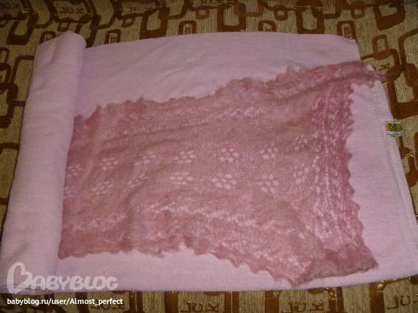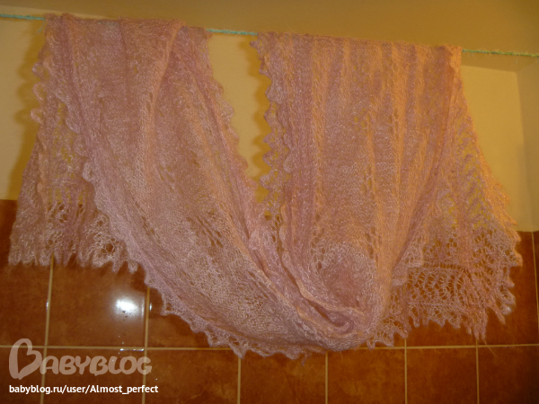 Вот и всё! Шарфик сохнет быстро и становится пушистым и красивым. Мой розовенький еще сохнет, а я покажу Вам мою белую паутинку, которую я постирала вчера таким же точно способом.