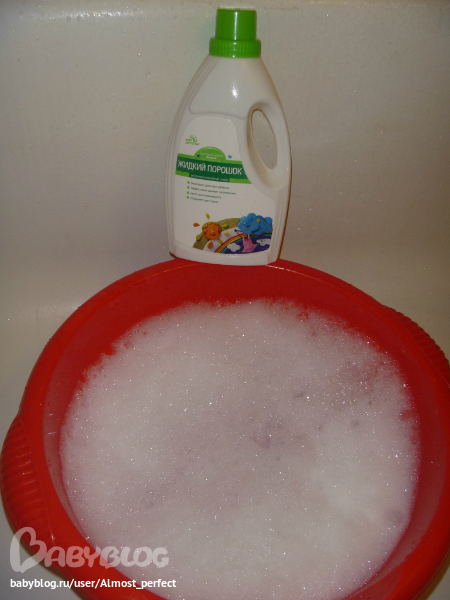 Разводим в теплой воде порошок или шампунь. У меня детский жидкий порошок Мир детства. Замачиваем шарфик минут на 20. Немного жамкаем и отжимаем, не выкручивая!!