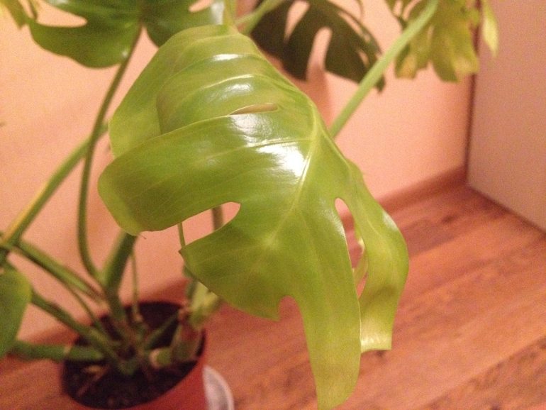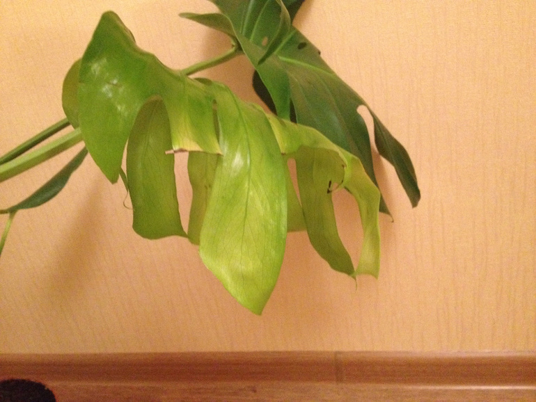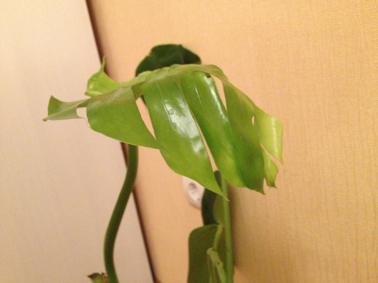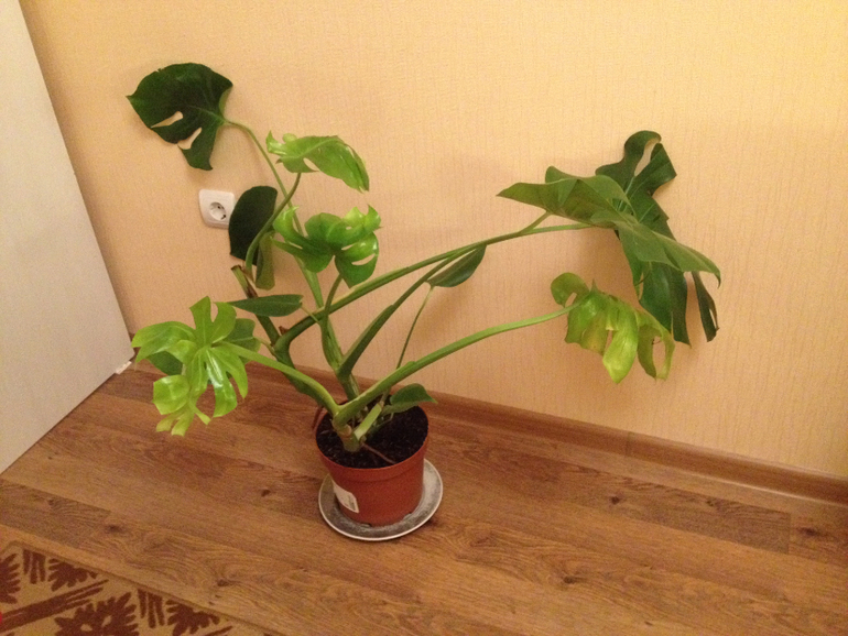 Монстера.При покупке магазинных растений,после адаптации-с недельку-две,их можно и нужно пересаживать в новый грунт.Купите грунт,добавьте вермикулит и перлит по горсточке,дренаж(промойте перед использованием),горшок побольше см на 10-15 для начала.Можете попрыскать эпином листочки.Молодые листочки неплохие,но им не хватает света(что понятно,время сейчас такое-у меня растюхи под лампами только себя как летом чувствуют и влажности.Все это должно помочь.