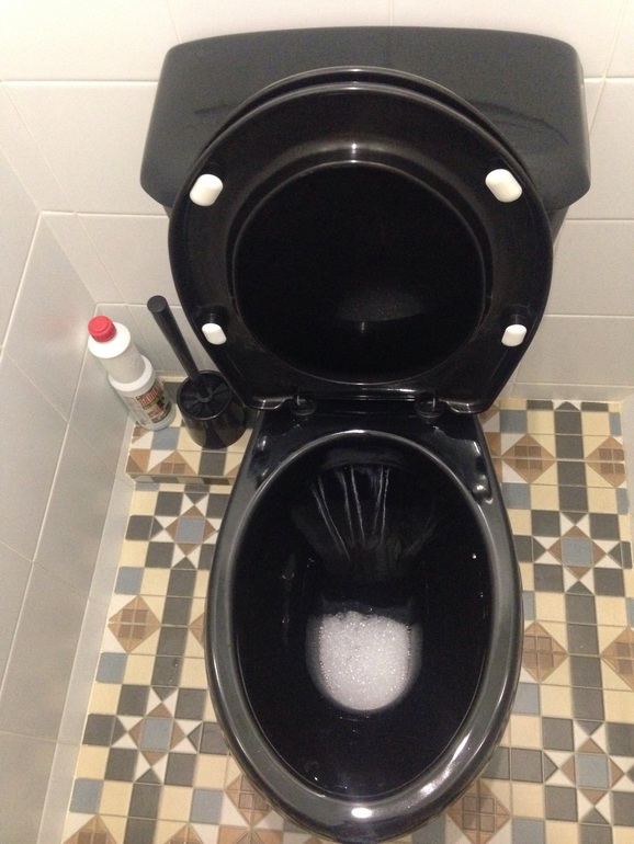 Вот честно, с черными унитазами дела не имела, но есть такие средства фирмы Unicum, это вроде российское про-во, вот они ВСЕ супер. Я мойку из иск.камня отмыла им на раз, а до того чем только не терла — доместосы всякие, силиты. Короче, увидите где — хватайте