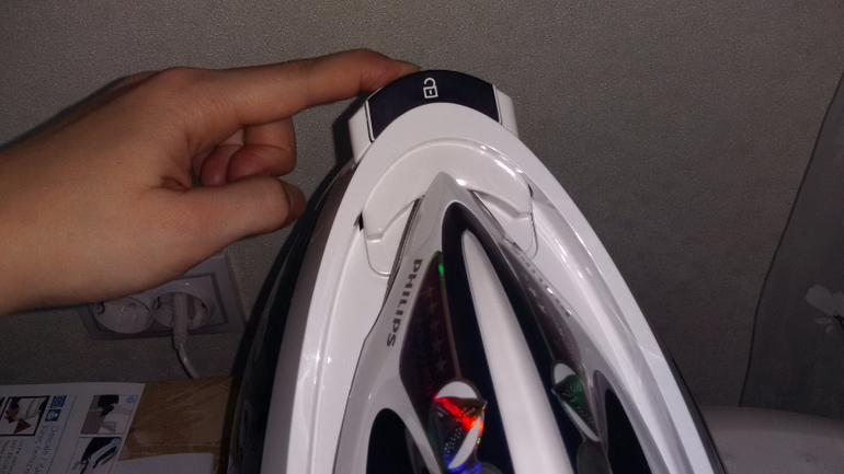 Еще, на корпусе имеется кнопка, которая фиксирует утюг, это позволяет переносить весь парогенератор за ручку самого утюга.