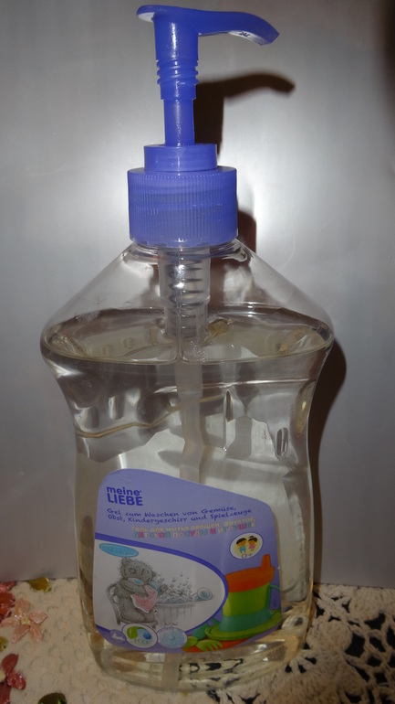Поэтому обратила внимание на гель для мытья посуды Meine Leibe(Дания). Он предназначен прежде всего для мытья овощей, фруктов, детской посуды и игрушек, что для мамы годовалого ребенка важно.