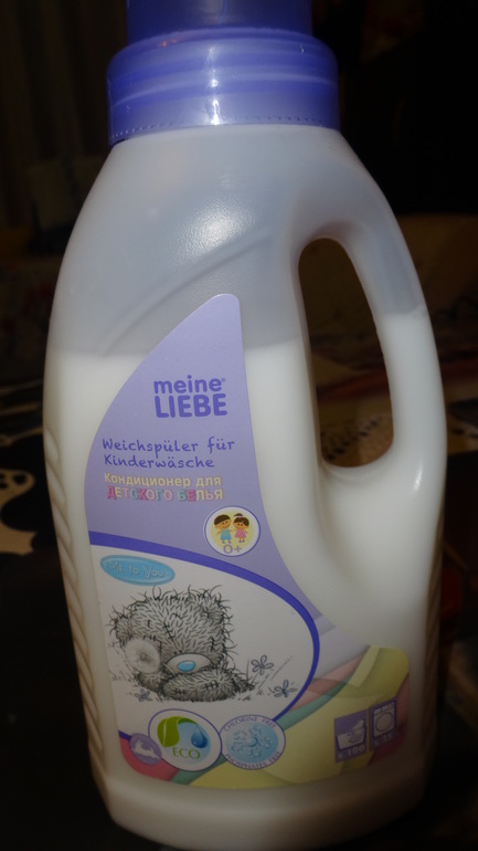 Бытовая химияПоскольку в последнее время я начала пользоваться продукцией Meine Liebe (Дания), хочу поделиться личными впечатлениями и от применения кондиционера для детского белья. Сначала конечно изучила этикетку. Понравилось что в составе средства нет химических агрессивных компонентов : «5-15-% кат-ионик сурфактанс( не поленилась посмотреть что это «катионное поверхностно-активное вещество», <5% парфюм, 5-15% катионные ПАВ, <5% отдушка сорбит калия. Прочее: вода, изопропиловый спирт,хлорид кальция». Вроде как состав приемлемый. Кондиционер Meine Liebe имеет очень приятный, свежий, совсем не резкий запах. После того как белье высыхает он практически не ощущается, а через некоторое время выветривается полностью. Лично мне не нравятся вообще никакие отдушки применяемые в кондиционерах, дающие устойчивые запахи,поэтому для меня это плюс. Да и ребенку это не надо. Белье на ощупь стало мягче, ничего не полиняло и не испортилось. И главное реакции кожи ребенка абсолютно никакой ни в каких местах не заметила, что очень хорошо. Кроме того на флаконе удобная ручка для наливания средства. Кондиционер экономичен в использовании, если наливать строго по инструкции. Но вот это сделать не так легко, потому что на колпачке нет делений для дозирования средства, а на глаз отмерить 5 или 20 мл средства для меня достаточно проблематично. Собственно это один мелкий минус данного продукта.