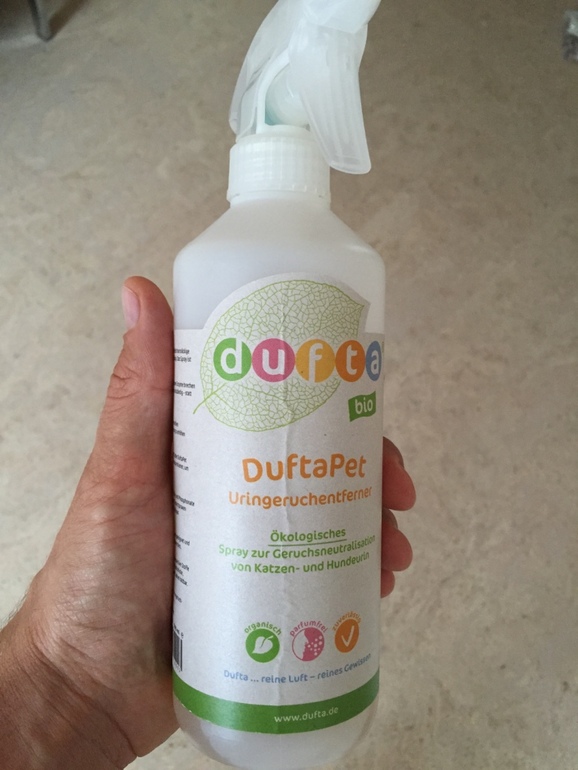 А где запах? Если не мягкая мебель, то я пол мою с Доместосом. А если мебель, то читала, что хорошо помогает средство от запаха мочи животных в зоомагазине.