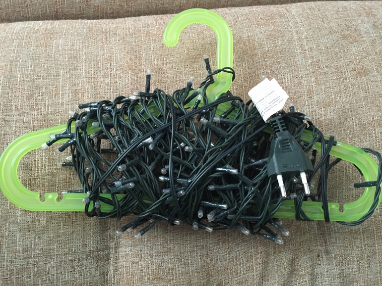 А я на втулку от туалетной бумаги накручиваю, в прошлом году тоже где то подглядела)) У вас наверное очень длинная гирлянда, раз целую вешалку занимает))