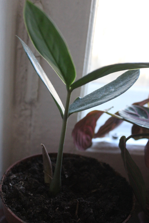 росточек дал два листика. Ростом около 5 см растение было почти год..жило с кактусом