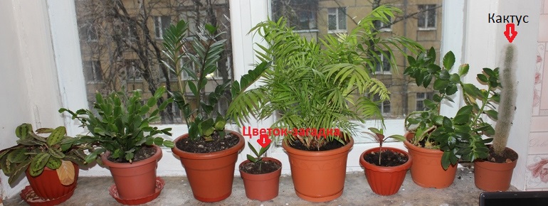 стрелочками указано, где кактус, а где цветок-загадка (фото 2014 года). на фото еще первый росток с 2 листиками и второй уже (чуть выше первого)