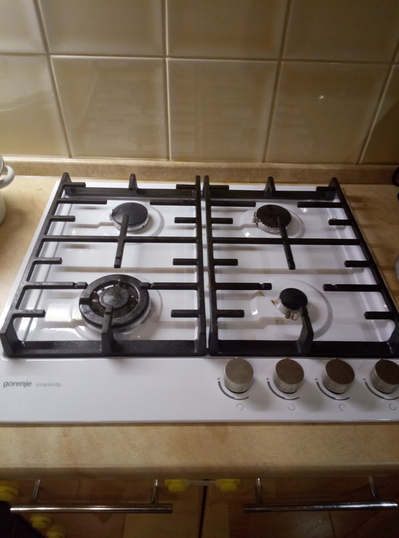 На газовой панели четыре конфорки, но пользуюсь двумя дальними, чтобы дети не добрались). У меня металлического цвета под решеткой.