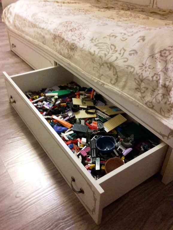 У меня прям проблема. В квартире люблю порядок, всегда стараюсь организовать его, чтобы все спокойно убиралось по местам и не было видно никому. В общем, все спрятано. Ну это ладно. Не суть. У деткй прям ну никак с чистотой. И я даже их не виню. Я сама не понимаю, как организовать им пространство. Может вы мне фоточки какие покажете? У нас лего...везде оно. Куда вот его ставить? Собранные именно. И вообще как-то не получается все у меня вместить и организовать. Вот думаю над стеллажами... ещё нужно куклы дочки куда-то положить.накупила контейнеров в своё время для маленьких деталей, но как-то не помогает. Все на полках, полу-везде! Никакого порядка. Все, что валялось, в пакеты покидала и пока убрала для видимого порядка, для себя)))