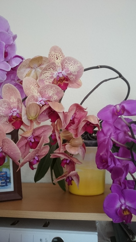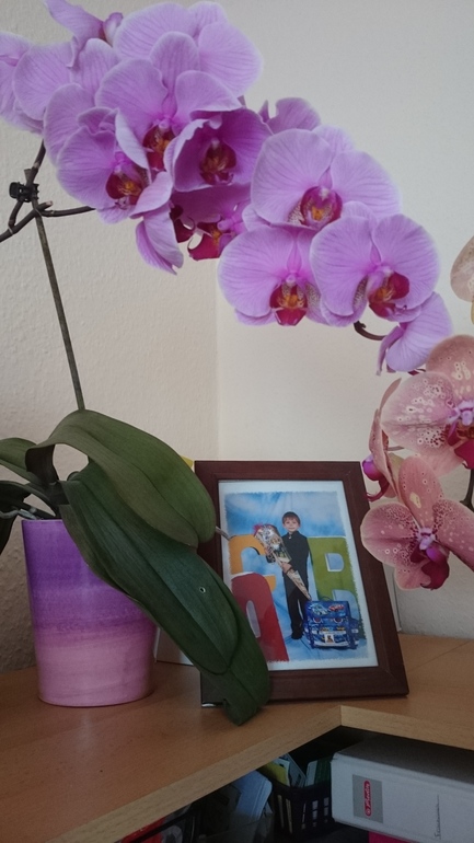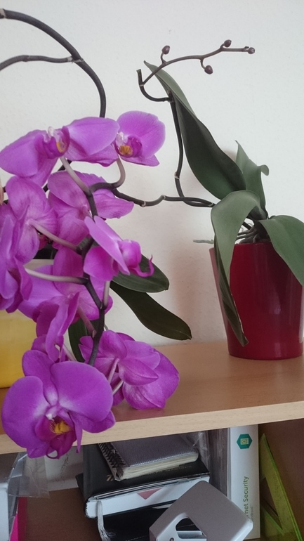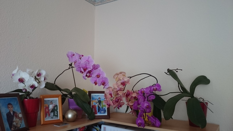 Когда я забила и решила будь что будет, они зацвели, отцветает один цветонос, тут же выпускают второй. Стояли на подоконниках, но места им там стало мало, (подоконники узкие,кпждый раз откидывая окно ловлю горшок с цветком)вот думаю, как разместить их на комп. столе.