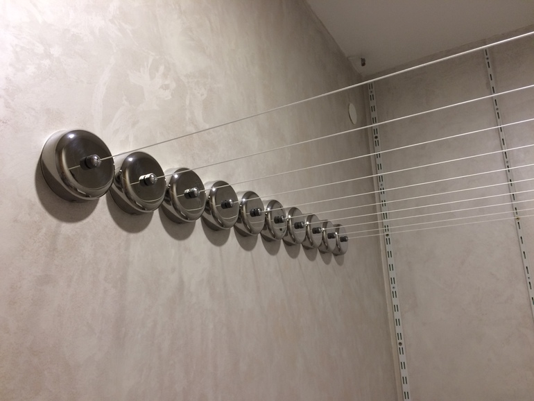 Просто прикручены уголки и на них натянуты веревки. Помещение неширокое, поэтому веревок нужно много, чтобы все уместилось.