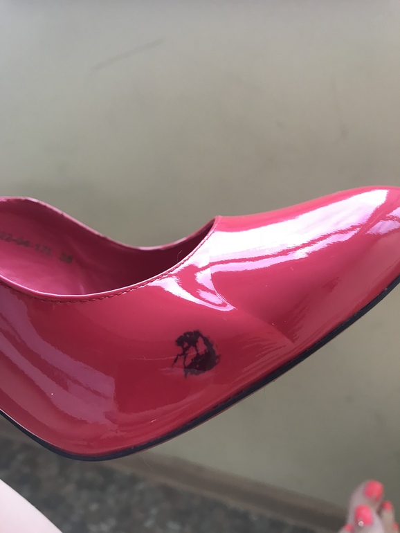 Жалко туфли. На худой конец, если ничего не поможет, клей момент и какое нибудь украшение, в таком месте вполне можно что нибудь придумать, будете потом всем рассказывать, что они у вас дтзайнерские😊 Напишите потом, удалось ли спасти туфли.