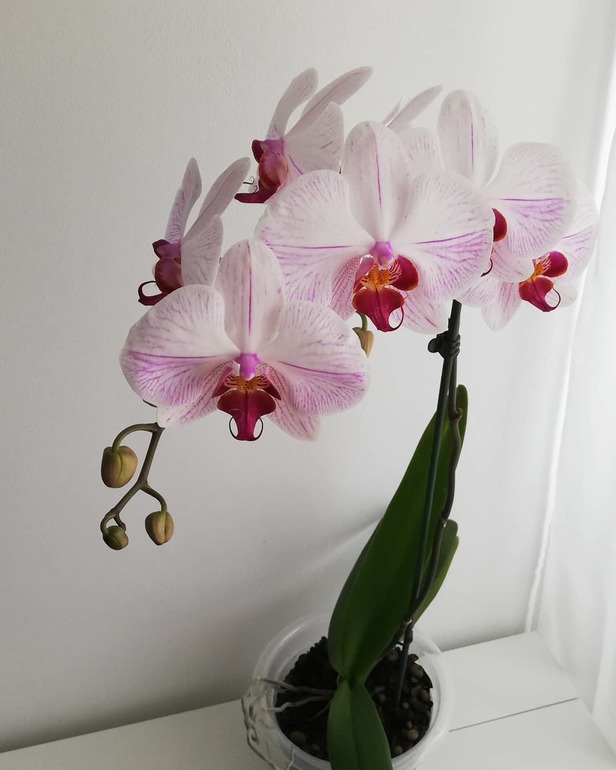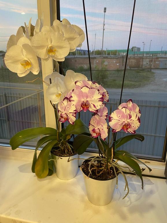 вот, абсолютно в таких же горшках, только в серебристых, цветут не затыкаясь)) Ещё последняя орхидейка не отцвела, как они обе по 2 новые палки выкинули, бутоны все распустились в начале июня