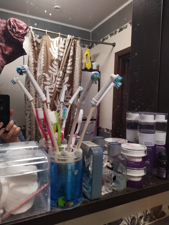 Четыре человека , щетки у нас две ,филипс, насадок четыре .