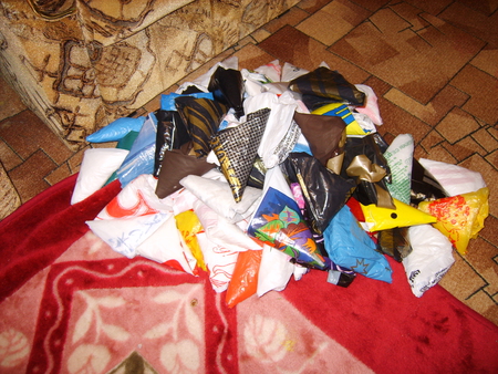 у меня терпения не хватит так сложить ТАКОЕ количество пакетов! у меня в угловом шкафу стоят пара баков для грязного белья, пластмассовые такие и немаленькие, так вот оба полные! и это с учетом того, что используем пакеты для мусора и выкидываем неформатные пакеты...