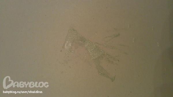 В результате на коленках подруги осталось большое количество воска, которое мы никак не могли полосками полностью снять, все перепачкались воском и плитку в ванной тоже. Притку стало жалко и пока намертво не прилипло, решили както воск с нее снять. Я тут вспомнила про экономик, чем мы и воспользовались. Отошло легко, правда губку, которой снимали воск, пришлось выбросить, т.к. воск к ней прилип. Я решила сфотографировать на телефон, вдруг пригодится для конкурса, так оно и вышло. Вот наши фото в процессе 1. до применения, 2. после намазывания экономиком, развели с водой на глаз, 3. минут через пять потерли и получили вот такой результат: