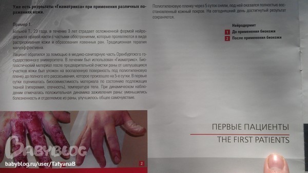 Атопический дерматит, аллергия, астмаНедавно узнала о российской разработке биокожи Гиаматрикс . Сразу подумала о подруге с сильным нейродерматозом, наступление ремиссии к сожалению не меняет качественное состояние ее кожи, такое ощущение будто пергамент становится и слоев эпидермиса не хватает. А тут попал ко мне случайно их каталог и впечатлила информация о лечении осложненной формы нейродермита. Больной Т, 23 года в течение3-х лет страдает осложнённой формой нейродермита правой кисти с частыми обострениями, которые проявляются в виде потрескивания кожи и формирования язвенных ран. Традиционная терапия мало эффективна.