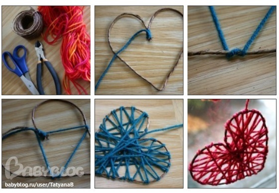 Следуя этой фотоинструкции,сделайте сердце из проволоки, а затем обтяните его нитками.