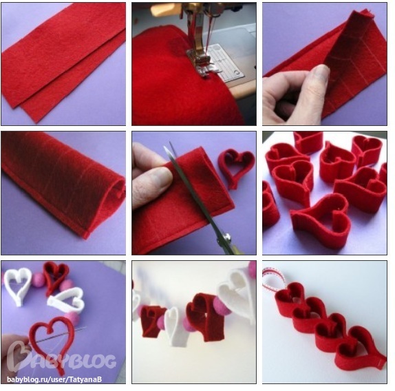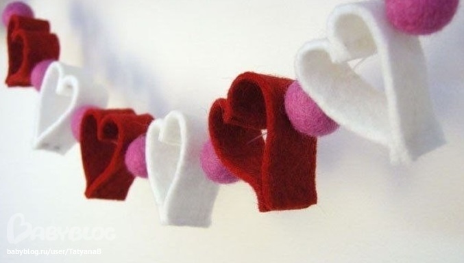Чтобы сделать чудесную гирлянду, возьмите несколько продолговатых кусочков фетра. Выбирать цветовую гамму лучше соответствующую - красный, белый, розовый цвета.