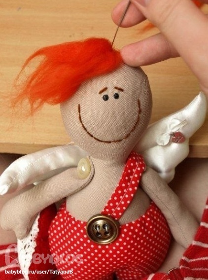 7. Вышиваем лицо и делаем прическу. Для прически можно использовать пряжу для валяния, приваливая ее по прядям.