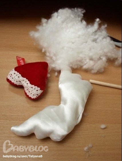 6. Шьём сердечко и крылышки. На крылышках прошиваем декоративные полоски от середины к концам.