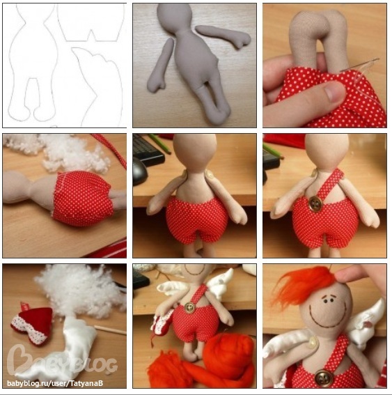 4. Выкраиваем и прострачиваем наши штанишки и лямку для них. Одеваем штаны, подворачиваем низ штанины и пришиваем ее к ноге потайным швом. Набиваем наши штанишки чтобы придать телу пышных форм.Пришиваем штанишки потайным швом. Можно заодно вшить лямку под штанишки.