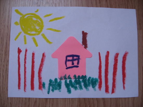 - Наш совместный рисунок...нам раздали бумагу, на ней домик приклеен из цветной бумаги, нужно было мелками разных цветов нарисовать забор, трубу, окошко, солнце и т.д....вот что у нас получилось