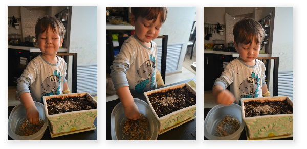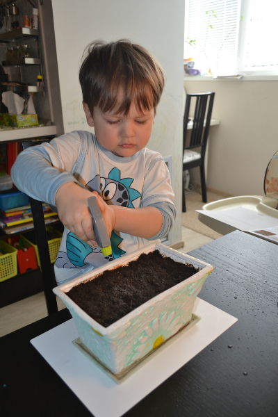 Процесс увлекательный - но грязный)))... После, сын сказал: "Трава вырастет большая и пойдет в цирк!". Удивительная логика... Может пора сводить ребенка в цирк?! Так-то мы еще не были)))