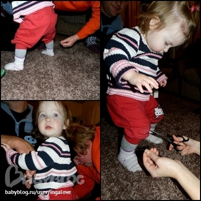 Моя тоже бегом от одного к другому))) На полу сама встает, но ходить пока не пытается... Надо правда с ножницами попробовать, раз уже от нескольких человек такое слышала:)