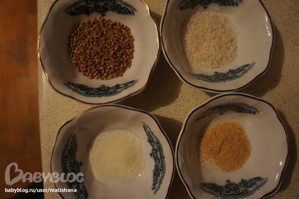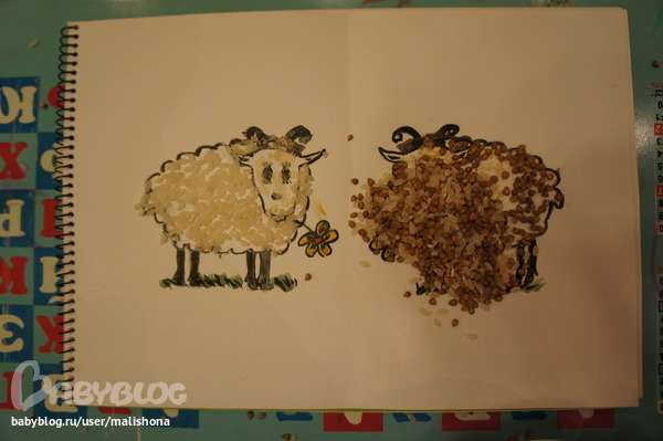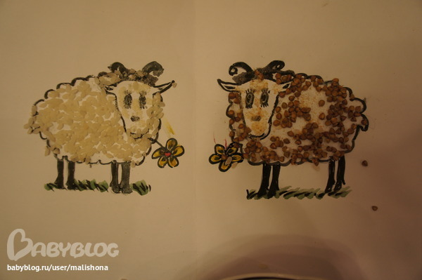 Решила, что овечки будут белая и коричневая. Для белой мы взяли рис и манку, а для коричневой гречку и панировочные сухари