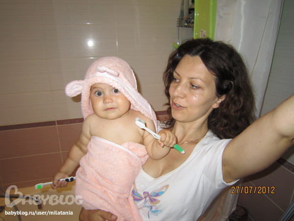 Я вот чищу сама,а доча-на ручках,держит крепко свою щётку и за мной наблюдает).И так каждое утро)))