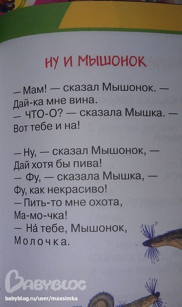Да, уж, тяжела жизнь детского писателя, о чем думает, то и пишет. Прям психологическая проекция в картинках. Корректор, редактор, издатель...через всех прошло и никто не зарубил. О чем это говорит? Все думают о том где и что, даже с кем уже не волнует, судя по тексту с мышам пить готовы.