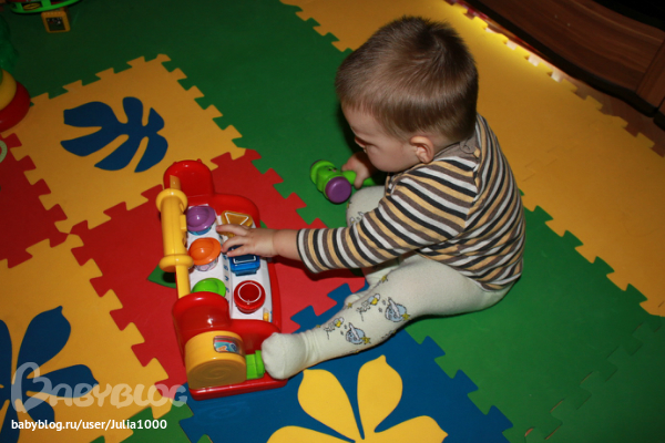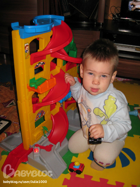 Стал играть в машинки! Наконец появился интерес. Недели 2 назад игрался с чем-то и вдруг откопал какую-то простую машинку среди игрушек и давай ею возюкать по всему коврику, изображая звуки "вжжжж, вжжжж", даже в коридор уполз, так заигрался. Потом распробовал, что значит играть в машинки, стал осваивать гараж-парковку, который до этого недели 3 стоял без дела. Теперь сам запускает с горок машинки, даже встает и с самого верха запускает. Стал проявлять интерес к домикам ферме и конюшне с животными: то кнопочки со звуками нажимает, то дверки открывает, то животных позакидывает в башню. Повозку без лошадки тоже использует в качестве машинки, тоже ею вжикает по полу.