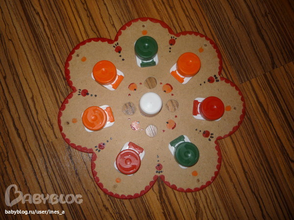 Ярмарка идей!Мы любим крышечки откручивать, поэтому решила вместо кучи бутылок, разбросанных по дому сварганить вот такой цветочек. Раскрашивала лаком для ногтей, уже полузасохшим - потому что гуашь пачкается, а чем другим не знаю.