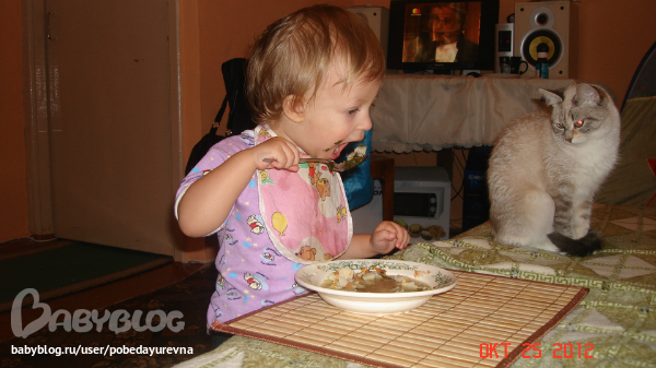 ничего себе вы уже кушаете сами, а мы всё возим по тарелке или опракидываем на себя .