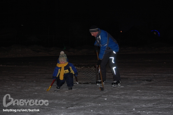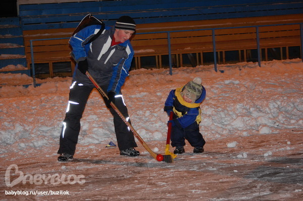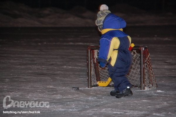 Идем на прогулкуНа днях наш папа вырвался с ребенком на каток (он у нас рядом с домом). А на кануне папа смотрел хоккей и сына приобщил. Короче, сын имел представлени что такое хоккей. Мы взяли клюшку и шайбу. Было весело! Какие же малыши неуклюжие!! А у Ромахи еще и комбез на овчине толстенный! Выглядело все забавно))) Фото