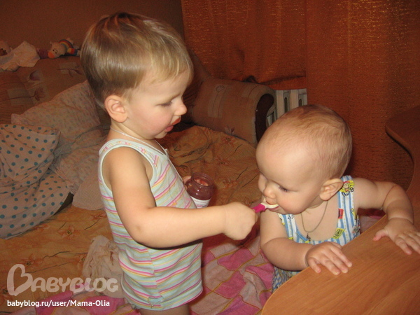 ((((. Сейчас я замечаю, как Ян всегда норовит то ли оттолкнуть младшего от себя; то немедленно отобрать игрушку(книжку), которую Алесь взял; то шлепнуть его по попе и по-взрослому прокричать : «Да-да!»(«нельзя!» на его языке), при этом строго махая пальцем в его сторону; да и ещё не хочет делиться, например, вкусностями, жадность берёт верх (я насыплю ему в стаканчик изюма или сушеных яблок очень много, специально, чтобы поделился с младшим - а он ни одной не даст((((((( ). Недавно появилась у Яна новая фишка: он просек, что если младший плачет, я всегда на руки беру его и успокаиваю – он тоже в это время начинает плакать без причины
