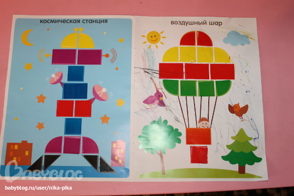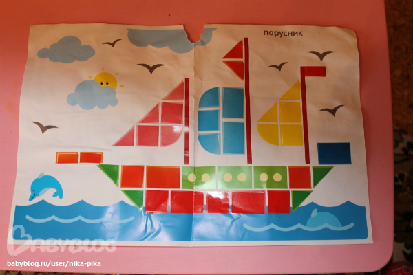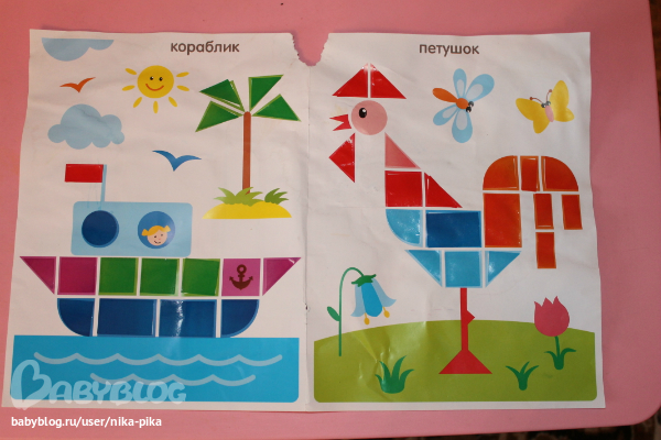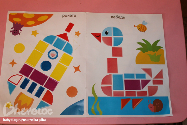 Очень понравилась нам в последнее время серия книжек "Чудесные наклейки".Там нужно из готовых разноцветных фигур сложить мозаику по рисунку. Очень увлекательное и познавательное занятие)). Дочка при это уже конкретно называет, например : "Мне сейчас нужен зеленый квадрат, или синий треугольник".