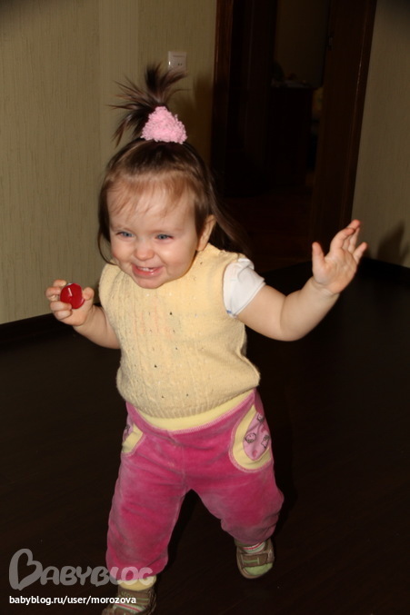 Растем и развиваемсяПравда случилось это 13 февраля. Полька отцепилась от стены и бесстрашно побежала. Ну и туловищем вперед естественно. На второй день она почему то боялась. Ползала, хотя вроде и хочет пойти, но боится. А потом уже поняла, что бегать - только падать и стала быстро ходить))) Очень смешно. А когда были первые попытки, она так смешно топала ножкой, визжала, когда делала хоть один шажок без рук у кровати. С визгом перебегала от меня к папе))) Ну радости уйма))) Сейчас падает конечно много, особенно вечером, когда уже уставшая. В общем пройден еще один этап)))Время время..
