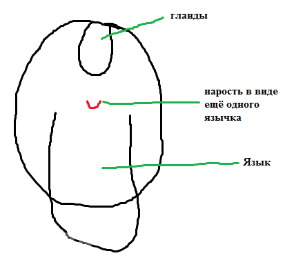 ДругоеДевченки решила посмотреть горло ребенка, ребенку около 2х лет, попросила сказать ААА и высунуть язычек и увидела в корне языка в районе гланд, только снизу на языке нарость в виде ещё одного маленького язычка чветло розвовго или желтоватого цвета, что это такое и правда рарость или это надгортанный хрящь?? вот как выглядет, простите за такой рисунок)