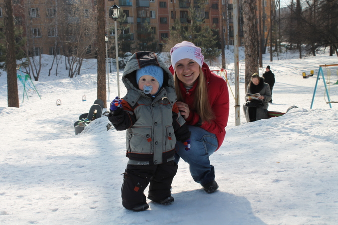 Прогулка. Конец марта, а весной еще и не пахнет. ((( Ходим на улице почему-то только с соской. Вытаскиваю-истерика. Наверное, ему так спокойней.)))
