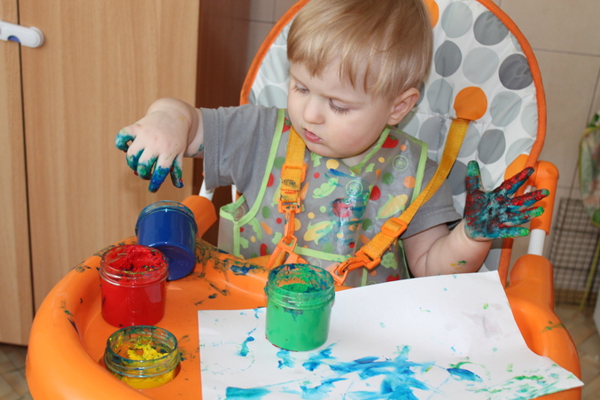 Твоурческие муки. Рисуем пальчиковыми красками. Потом мама отмывала Никиту и всю кухню, где проходил творческий процесс.