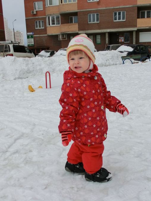 это я хожу за ней по площадке или сижу, а она носится, лезет на горку, перелезает через сугробы - ей в зимнем уже жарко))