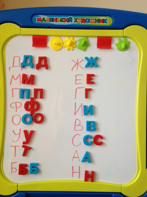 3) учим буквы,нам это тоже нравится,знаем штук 15.И еще я рисую на доске буквы,Варя ставит напротив магнитные,вот так:эти буквы мы знаем хорошо)