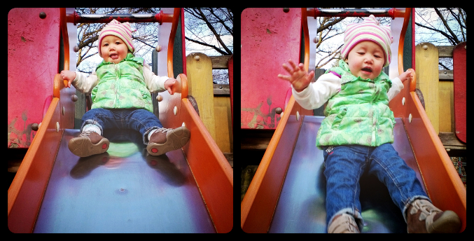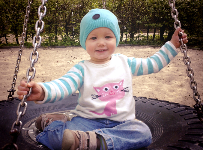 Саша тоже никогда особо не смеется на горке) - вот подружка София - прям хохочет - а моя сурйозная, ух!А тепреь воообще старается на животик перевернутся во время скатывания) и все тоже очень серйозно)))))
