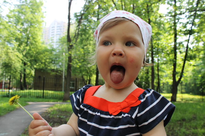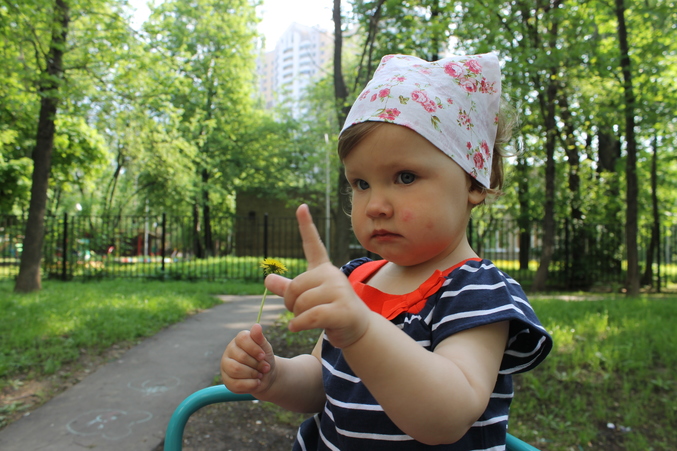 Фанатеет от разного рода качелей и горок. И во время прогулок обязательно сжимает в руке цветочек - мать-и-мачеху, одуванчик и т.п. По просьбе протягивает цветок понюхать. А сама нюхает вот так: