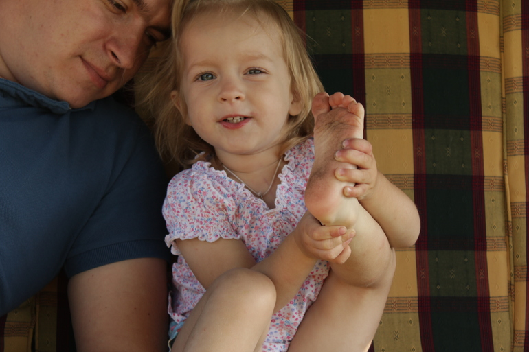 Ходим босичком по камушкам и у бабушке на даче. Маша купается уже во всю, а маме еще холодно)