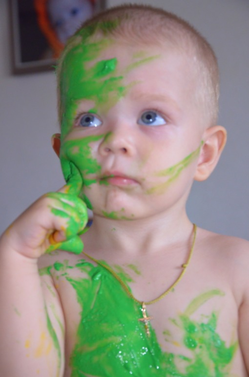 Да где то с года, может раньше)) Ну грязновато, ничего потом в ванну)) Это пальчиковые краски!) Вот 5 минут рисуем, 30 минут купаемся!) Я просто не знаю, чем его еще занять, ходит слоняется, и хулиганит)))