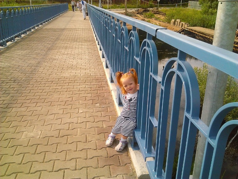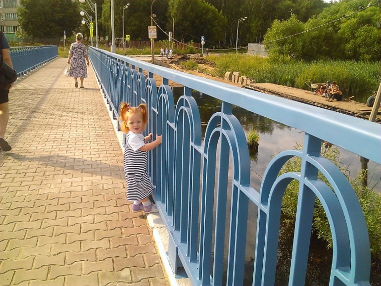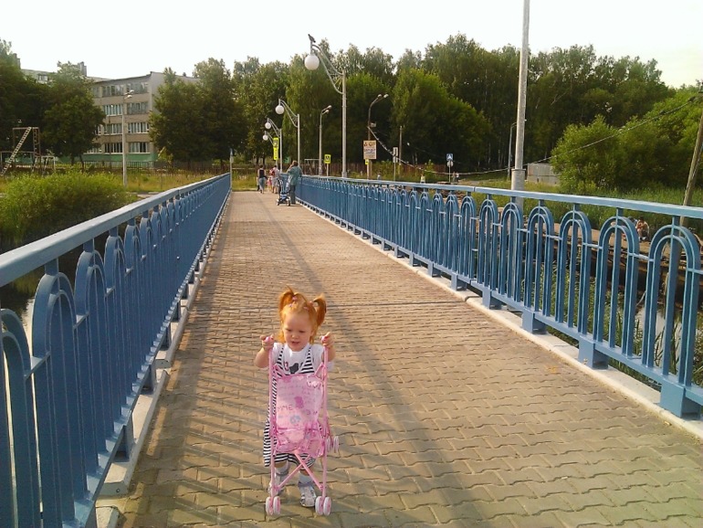 Идем на прогулкуОткрыли возле нашего дома новый мост, дочь зависла на нем почти на всю прогулку. Снизу видно уток, сверху летают птички, а больше нам ничего и не нужно.