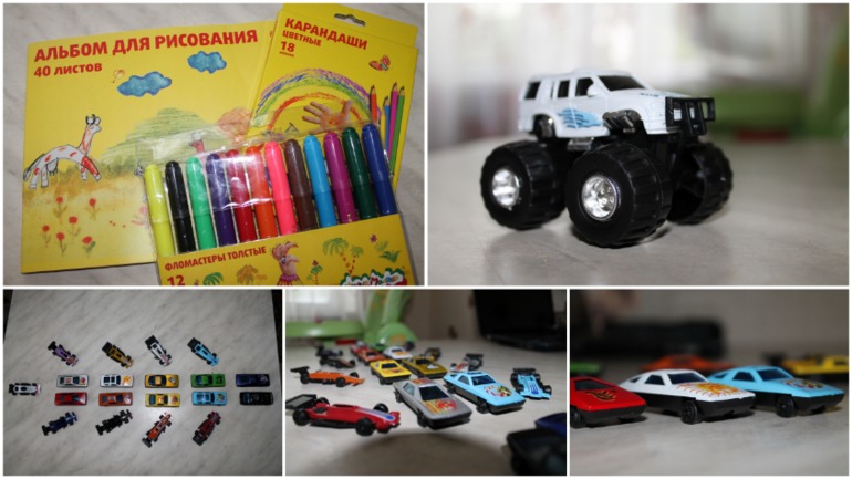 Набор машинок состоит из 20 маааленьких машинок разного цвета с разными рисунками на капоте и металлическим корпусом, Кириллу оочень понравились эти машинки, себя помню, в детстве была типа такой, я с ней в песке играла)) А у машинки побольше,тоже металлический корпус и большие колеса, удобно держать в руке или запускать на полу. Ну и в довершение ко всему фломастеры, карандаши и альбом, такие мелочи, а приятно)))